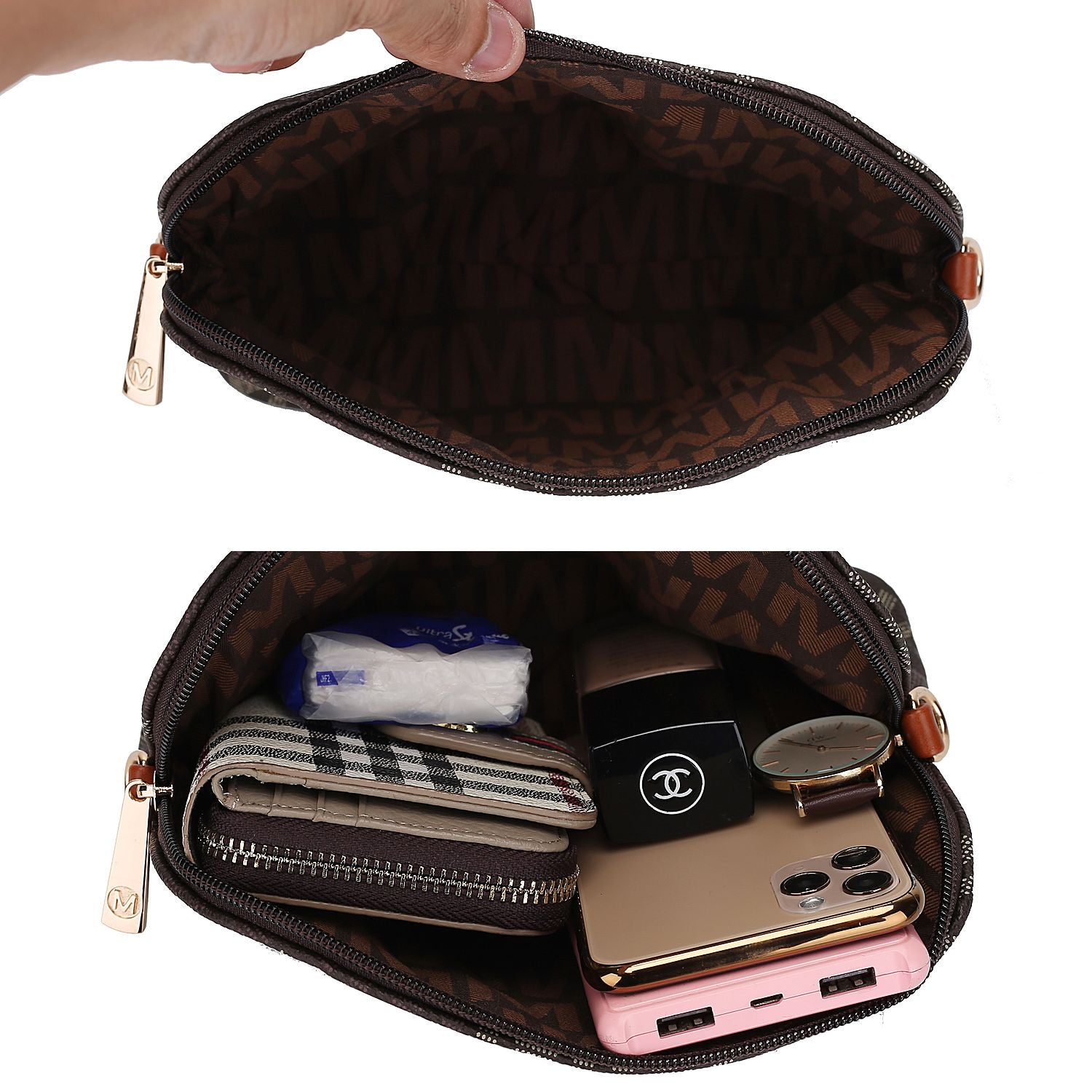 The interior of the Mini tote, pouch, and wristlet features a spacious compartment each one.