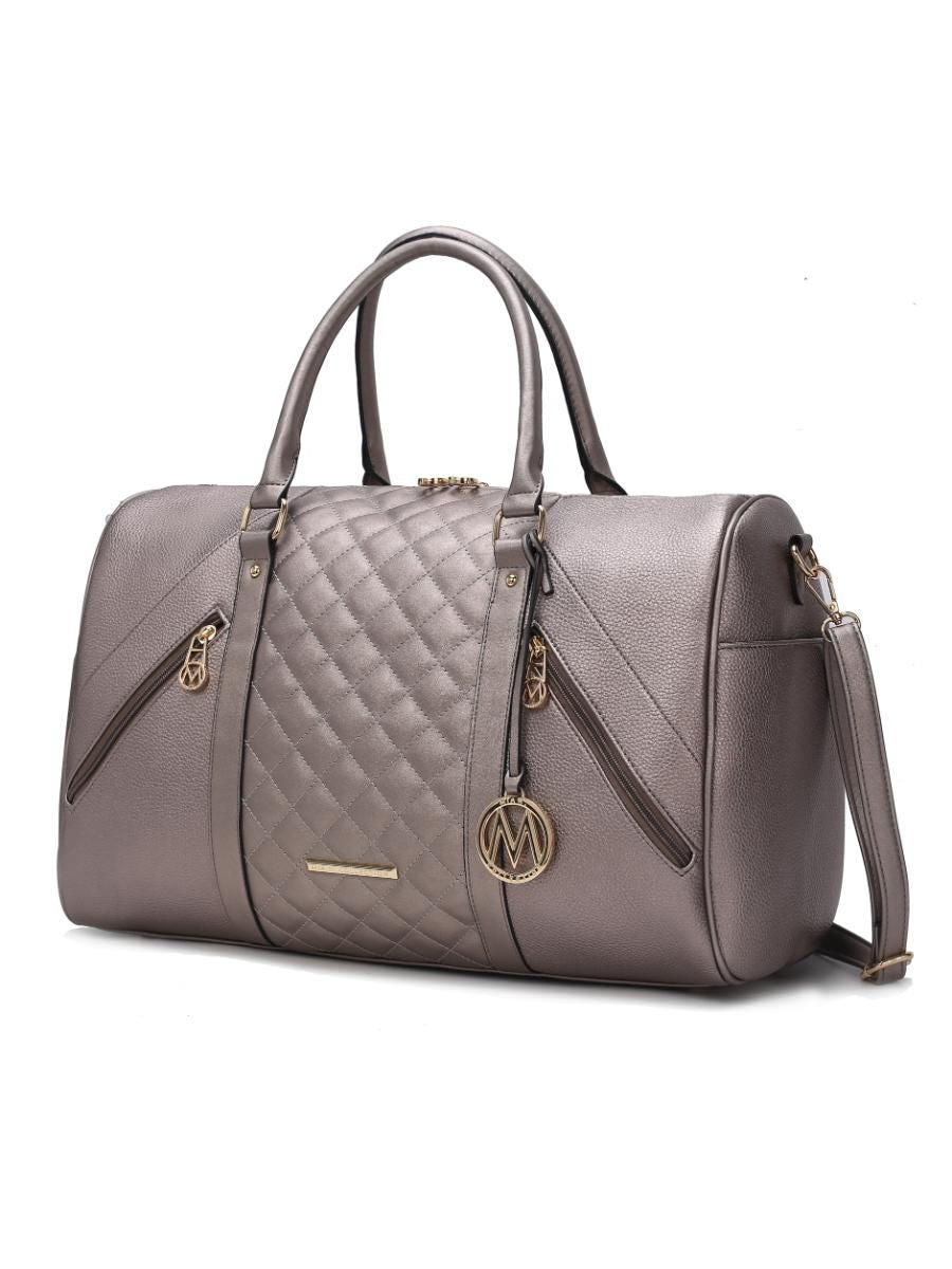 Adding a touch of luxury, the quilted front detail elevates the bag’s aesthetic, creating a textures and sophisticated look. The quilted pattern not only adds visual interest but also brings an element of timeless style to the overall design, making this duffle bag a statement piece for any occasion.