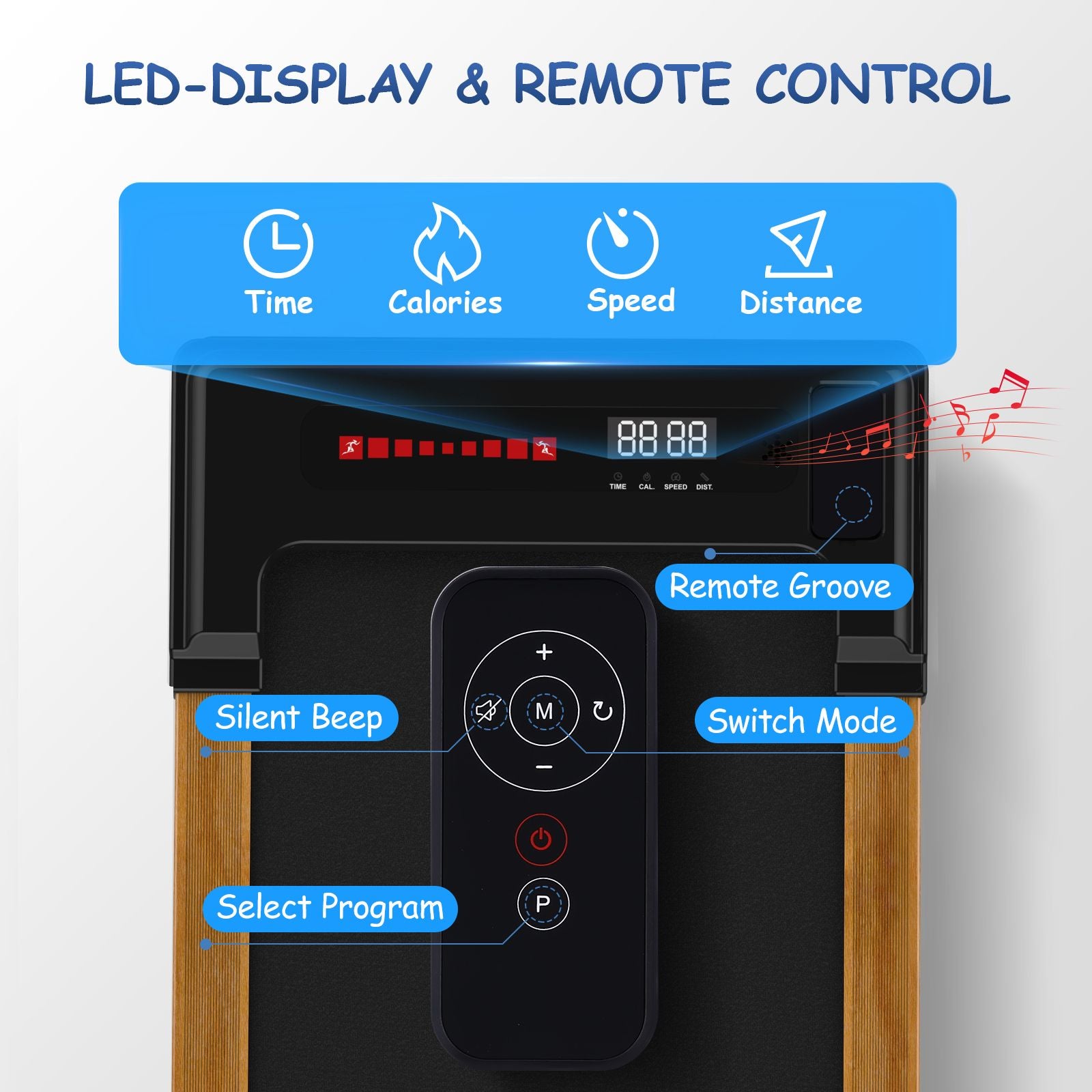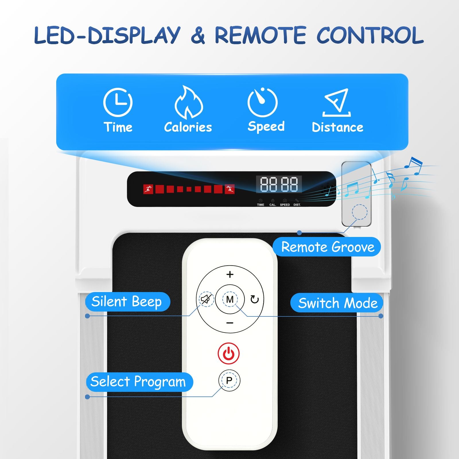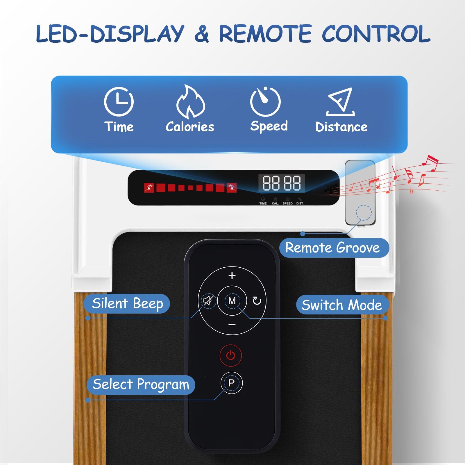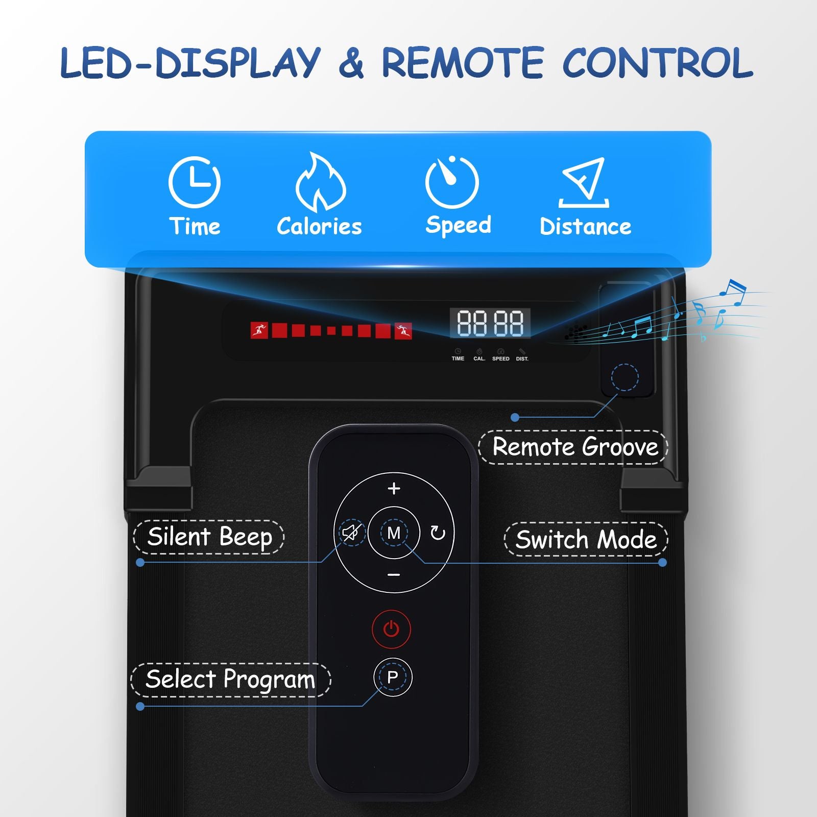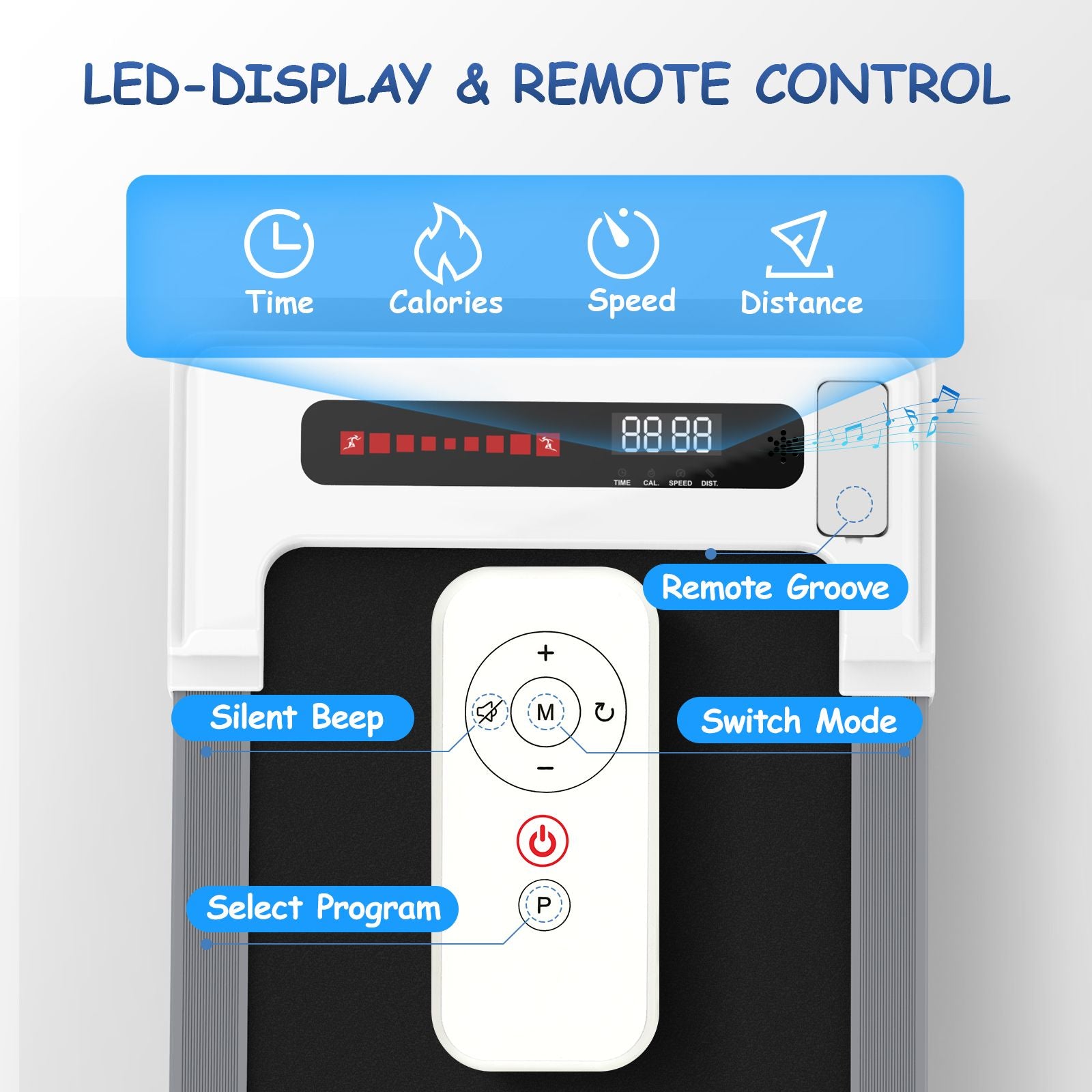 The LED Display & Remote Control: This portable treadmill with LED display allows you to track speed, distance, time and calories in real time, The remote control is convenient for you to adjust the speed and modes while running.