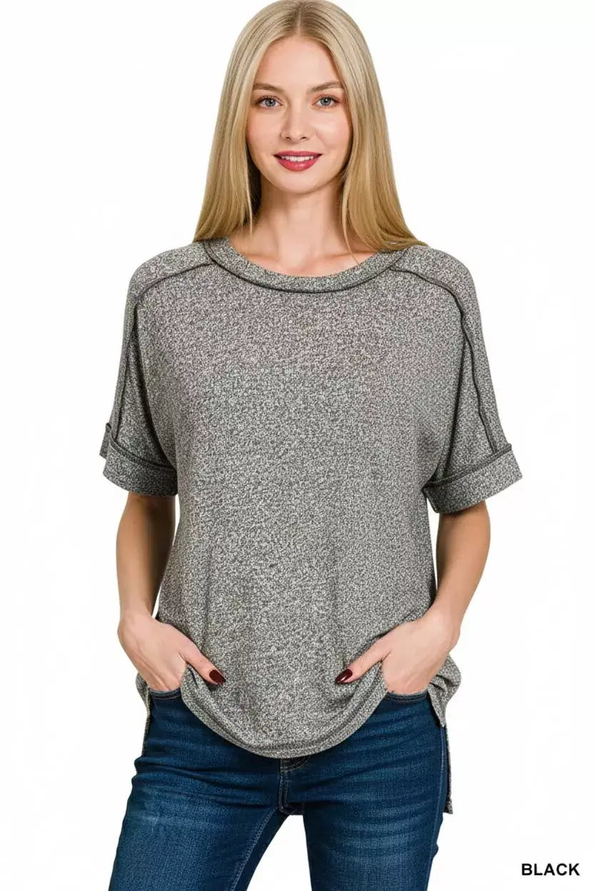 Zenana Full Size Soft Melange Hacci Short Sleeve Hi-low Tee Plus Size