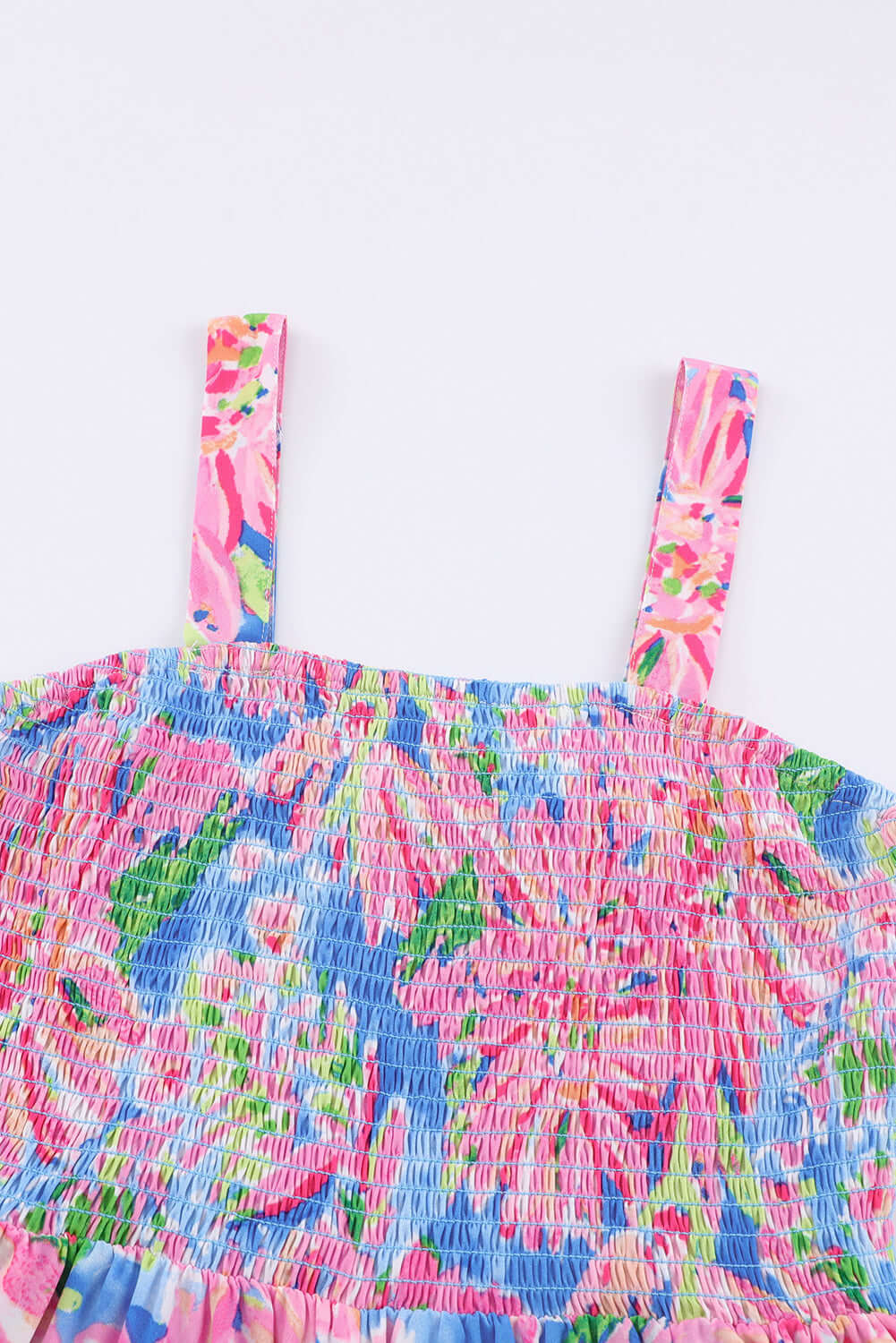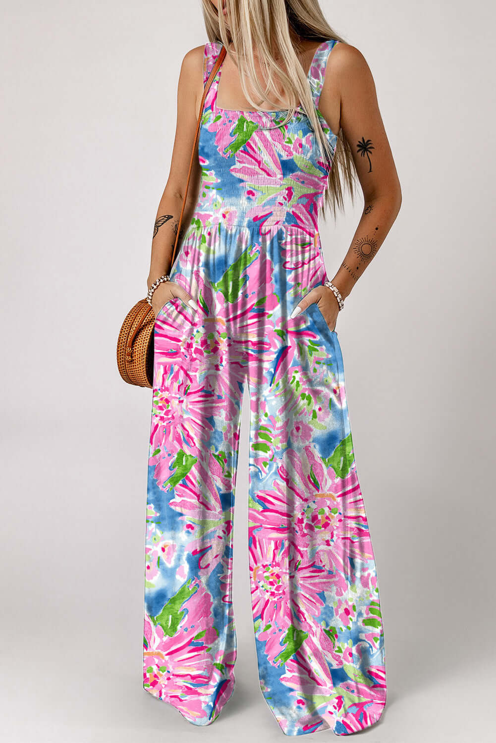 - Floral Smocked Square Neck Jumpsuit with Pockets