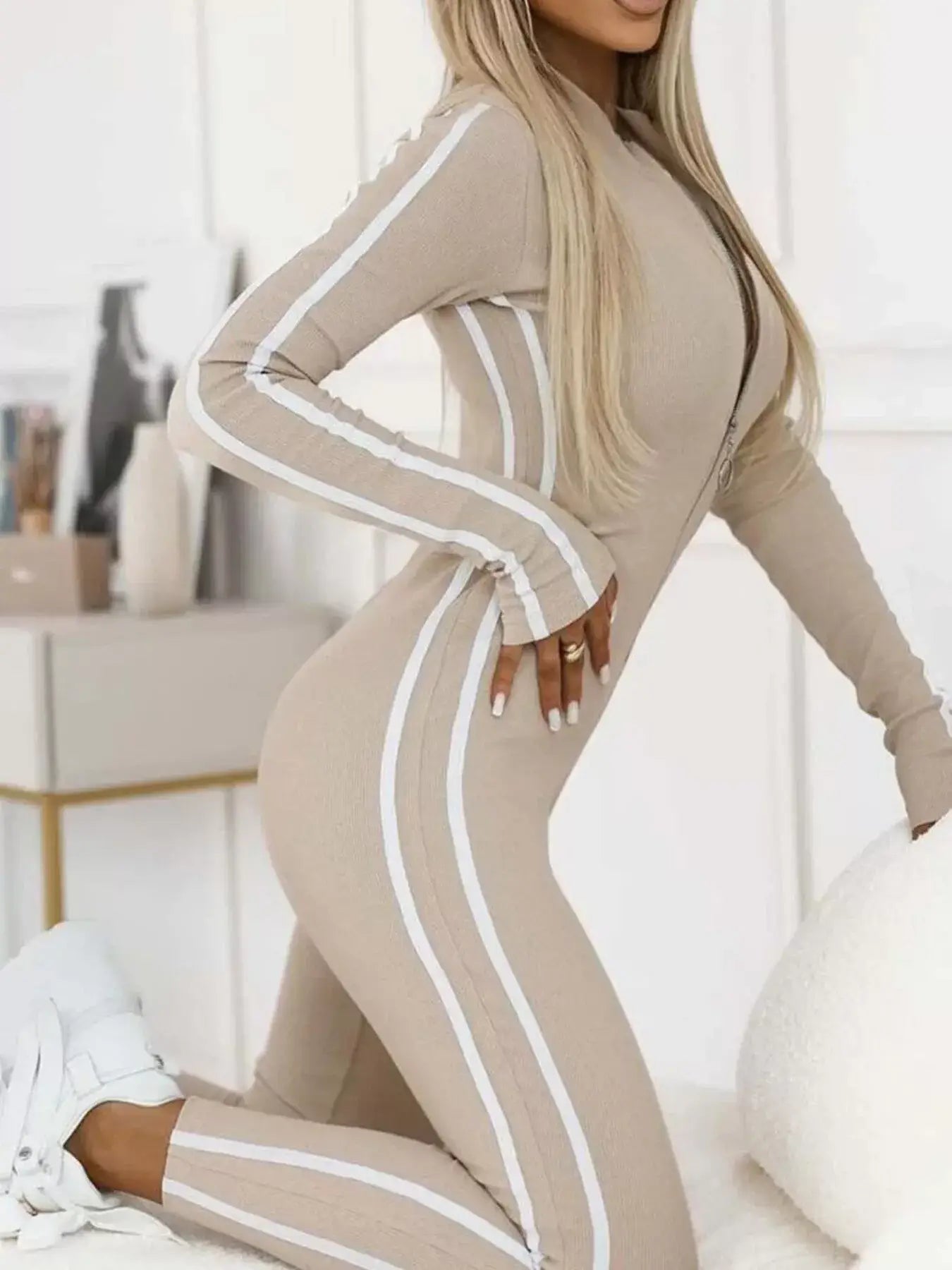 - Full Size Stripe Zip-Front Long Sleeve Jumpsuit Plus Size
