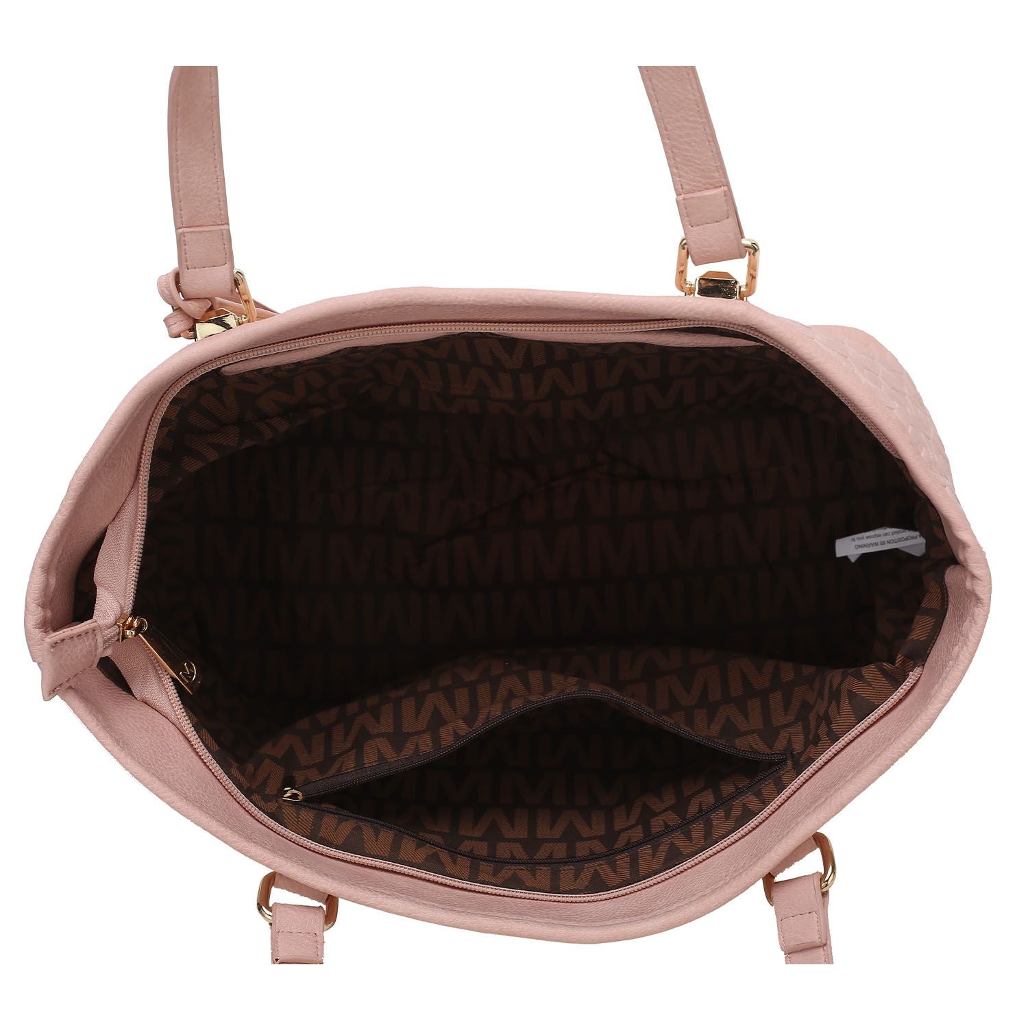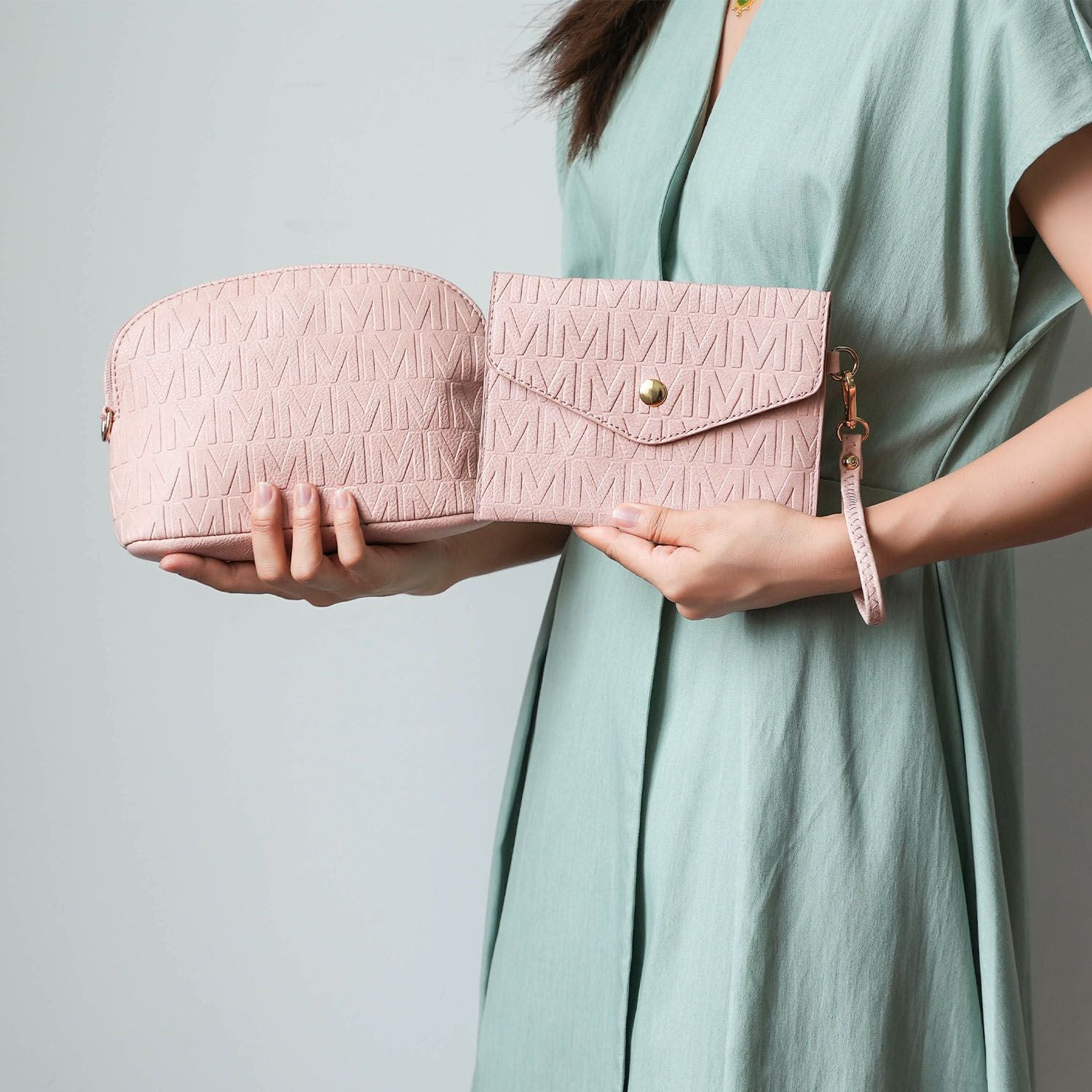 Arya M Signature 4 PCS Tote Set by Mia K. This luxurious and versatile set is designed to cater to all your fashion needs. Featuring an embossed M Signature pattern, This Tote Bag Set includes four pieces: a spacious tote, a matching crossbody bag, a chic wallet, and a stylish wristlet. Each piece combines elegance and functionality, ensuring you have the perfect accessory for any occasion.