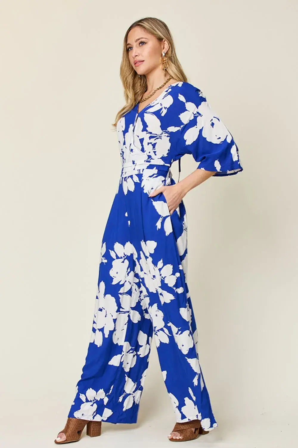 Double Take Full Size Printed Tie Back Wide Leg Jumpsuit