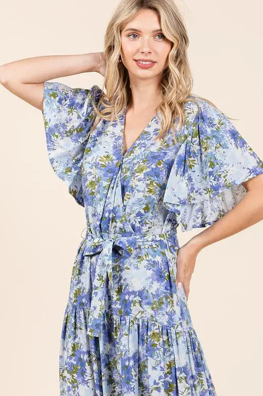 The Floral Tie Waist Flutter Sleeve Tiered Dress is a graceful and charming option for a feminine look. The floral print adds a touch of whimsy, while the flutter sleeves and tiered design create a flowy and ethereal silhouette. With a tie waist detail for added definition, this dress offers a flattering and versatile style that can be dressed up for special occasions or worn casually for a bohemian chic vibe. Pair it with sandals or wedges for a romantic and effortless ensemble that exudes grace and elegance.